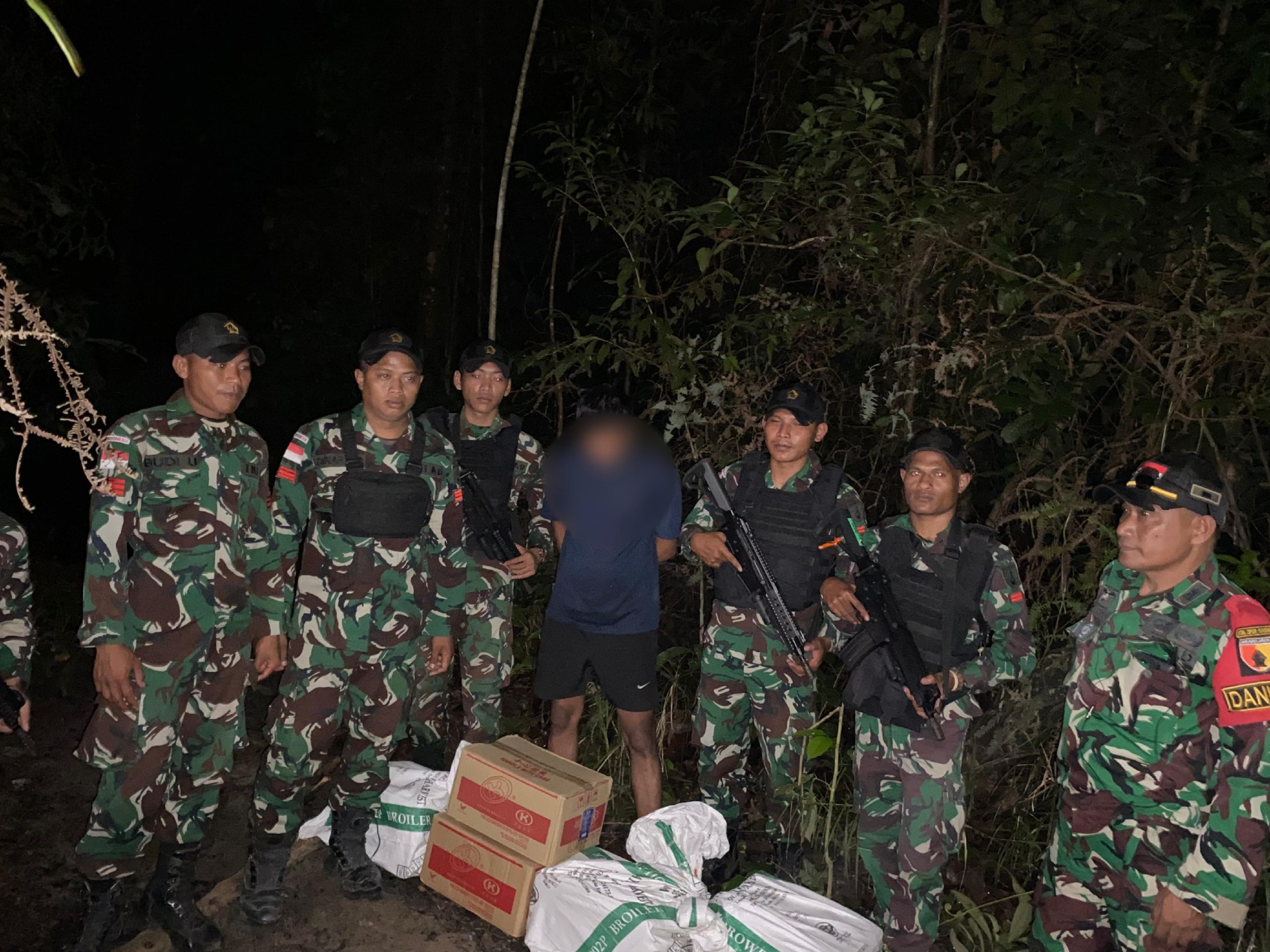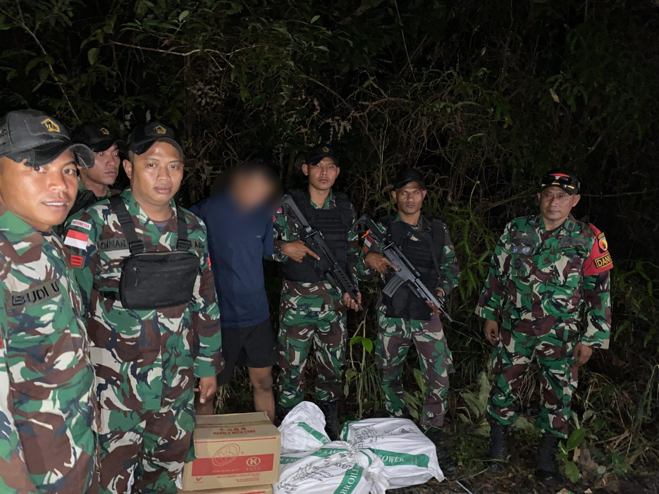 Sintang Kalbar, onewsmedia.co.id – Satgas Pamtas RI-Malaysia Yonzipur 5/ABW Kodim 1205/ Stg dari Pos Sei Kelik berhasil menggagalkan penyelundupan minuman keras ilegal jenis Brandy Sejumlah 5 Dus (120 botol) di Desa Sungai Kelik Kecamatan Ketungau Hulu, Kabupaten Sintang, Kalimantan barat, Minggu (13/10/2024).